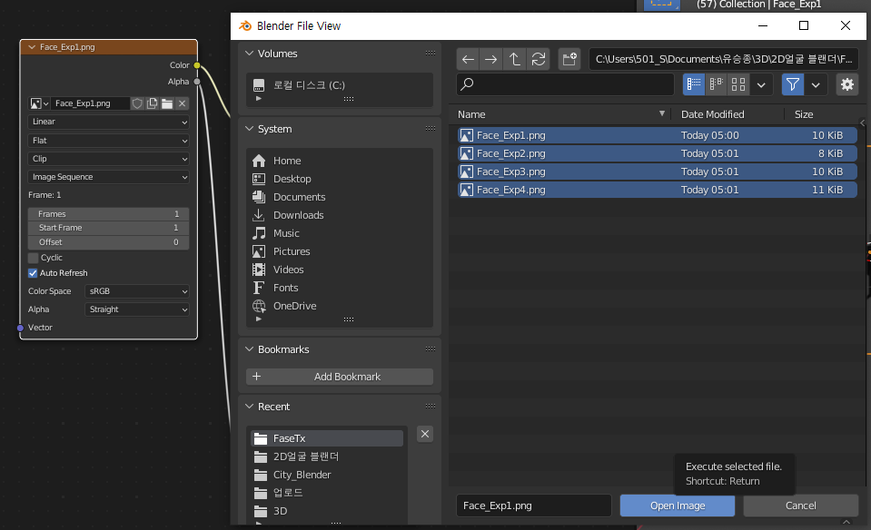 04. 셰이더 에디터에서 커피색상의 Face.png를 움직여 떨어트린 후 Clip 아래 항목에서 Image Sequence를 확인하여 맞춰놓고, 폴더모양을 누르고 해당되는 이미지파일 전체를 선택하여 Open Image 버튼을 누르고 모두 열어본다.