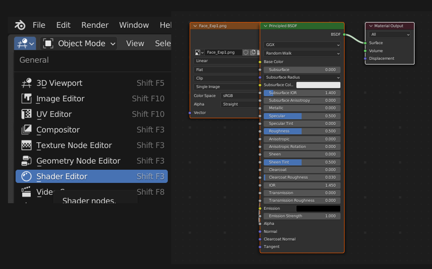 03. 좌측하단의 + 형태의 아이콘이 보일때 클릭 앤 드래그하여 창을 분할 하고, 좌측 Editer Type에서 Shader editor를 선택한다. 셰이더 에디터는 렌더링에 사용되는 재료를 편집하는 데 사용되며 렌더러(Eevee, Cycle)에서 사용되는 재료는 줄기형태의 Node Tree를 사용하여 정의됩니다.