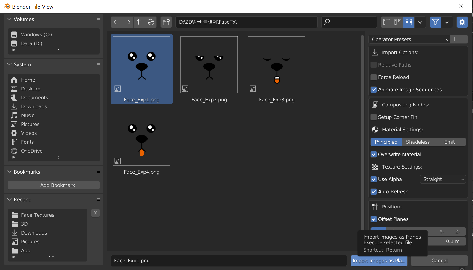 02. 특정폴더내의 이미지시퀀스 Fase_1.png와 같은 형식의 이미지 일련번호 1호 파일을 선택하고 Images as Planes 버튼을 누른다.