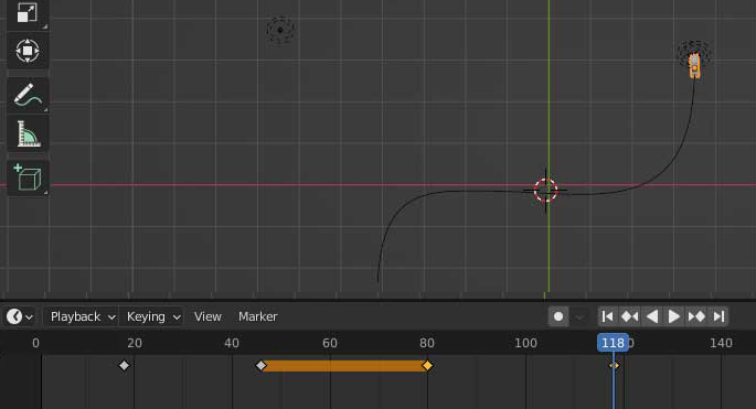 움직일 대상과 추가하기를 통해 경로(Curve)를 그려주고, Object Constraint를 통해서 애니메이션을 주는 작업을 진행합니다. Add추가하기에서 Curve - Path를 추가하고 Edit 모드에서 경로를 점 기준으로 움직이거나 연장해서 만들어 줍니다. 움직일 오브젝트는 Alt+G를 눌러서 초기화된 오리진의 중심 부분을 꼭 유지해야한다.