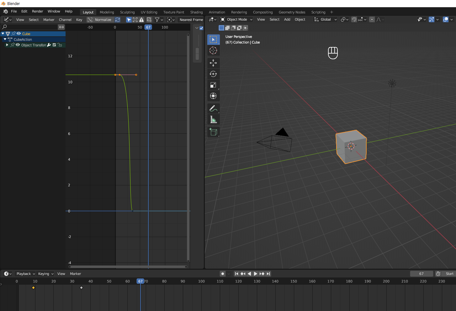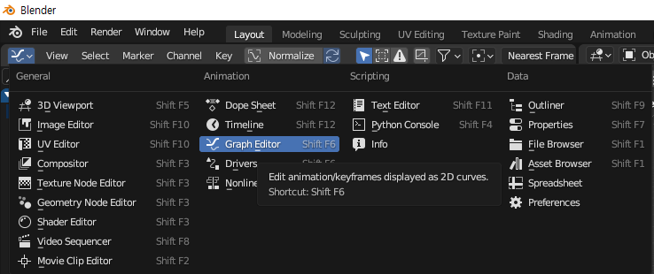 애프터이펙트와 같이 가속도등 점차 빠르고, 점차 감속하는 속도감을 주는 경우에 블렌더에서도 Graph Editor를 통해서 텐션감 있는 표현을 할 수 있습니다. 좌측 상단의 놓고 + 표시로 창을 추가한 후에 좌측상단의 Graph Editor 목록을 찾아서 Graph Editor로 바꿔 줍니다.