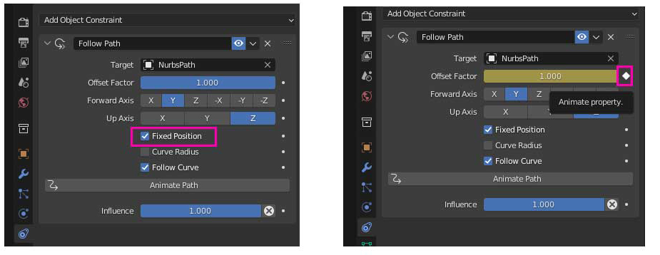 01. 움직일려는 오브젝트를 선택 후 오브젝트 제약(Object Constraint) 탭을 누른 후 Follow Path(경로를 따라가기)를 선택한다. 추가된 Follow Path에서 Target을 지정해준다. Follow Curve를 체크하고 아래 Animate Path버튼을 누르면 애니메이션이 진행됩니다. 거꾸로 가는 경우는 Forward Axis에서 Y 라면 반대의 축 -Y를 지정해줍니다.