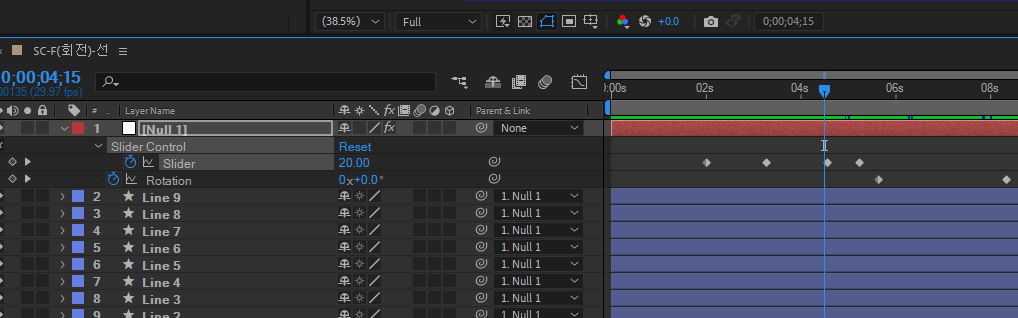 04. 라인 레이어에 회전속성인 'R'을 누르고, 아래 그림과 같이 Expression:Rotation의 골뱅이 모양의 아이콘을 위 Null Object의 Slider Control 내의 Slider에 연결시켜준다음에...