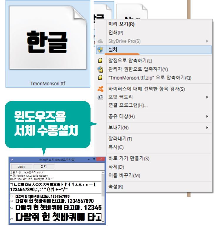 수동설치 는 Font파일을 오른클릭 후 ‘설치’라는 명령을 선택하거나, 서체를 더블클릭한 후에 보이는 보기창에 ‘설치’라는 버튼을 클릭하면 쉽게 설치됩니다. 설치 후 응용프로그램을 다시 실행하면서 서체인식 후 사용할 수 있습니다.