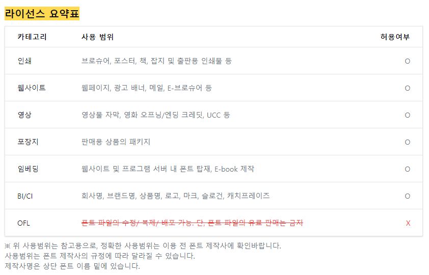 단, 상업적으로 사용가능한 무료서체를 이용해야 후일 발생할 수 있는 저작권 침해로 인한 법률사무소의 연락과 검찰청을 오가는 금전적이고 심리적인 부담의 위험을 사전에 예방할 수 있습니다. 여러분에게는 부담없이 상업적으로 사용가능한 눈누에서 검색가능한 무료서체를 추천합니다.