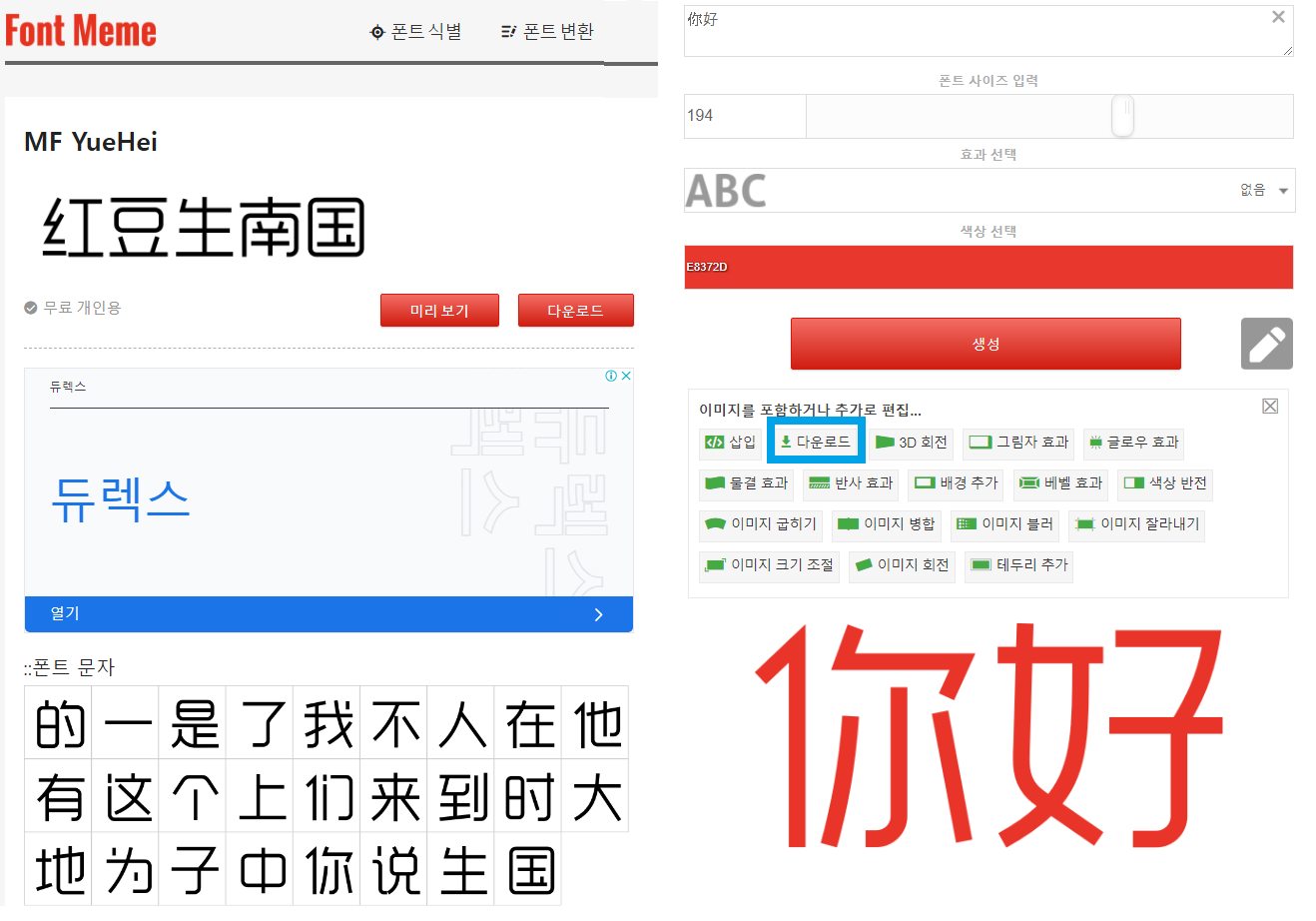 한자들은 입력 및 표기방법도 힘듭니다. 쉽게 원어민이 번역한 MS Word, 구글번역기 등에서 문서 원문을 작업중인 곳에 붙여서 사용하는 것을 추천합니다. 디자인 중 본문은 본고딕 한자서체를 직접 다운받지 않고 활용하자. 예를 들어서 복(福)을 구글링하여 서체를 얻어낸다. "복 한자, 대한민국 한자"라고 검색하면 쉽게 한자를 얻어서 미리보기를 지원하는 경우, 서체 붙이고 폰트사이즈 입력하고, 또 효과를 선택해 보면 미리보기한 PNG를 다운로드한다면 서체설치 필요없이 바로 사용할 수 있는 좋은 방법이니 아래 무료한자 사이트를 추천한다.