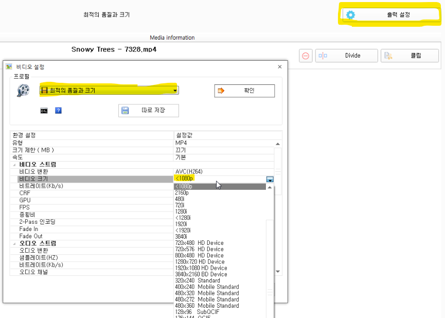 추가한 파일을 출력설정을 통해 품질과 비디오의 크기를 조절하고 있다. 실행을 하면, 4K비디오를 품질차이가 가의 안나면서 용량이 줄어든 2K 비디오 파일로 변환이 가능하다.
