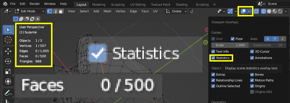 선택한 표면의 갯수를 파악하는 방법 Viewport Overlays ▼ Statistics를 체크하면, 외쪽에 선택한 Object의 Faces, Triangles 수를 확인할 수 있다. 그럼 품질좋은 애니메이션 등에 사용하는 표면이 부드럽고 모서리가 둥근 표현은 모디파이어-서디비전 서페이스가 High poly로 많은 표면을 만들어 낸다.