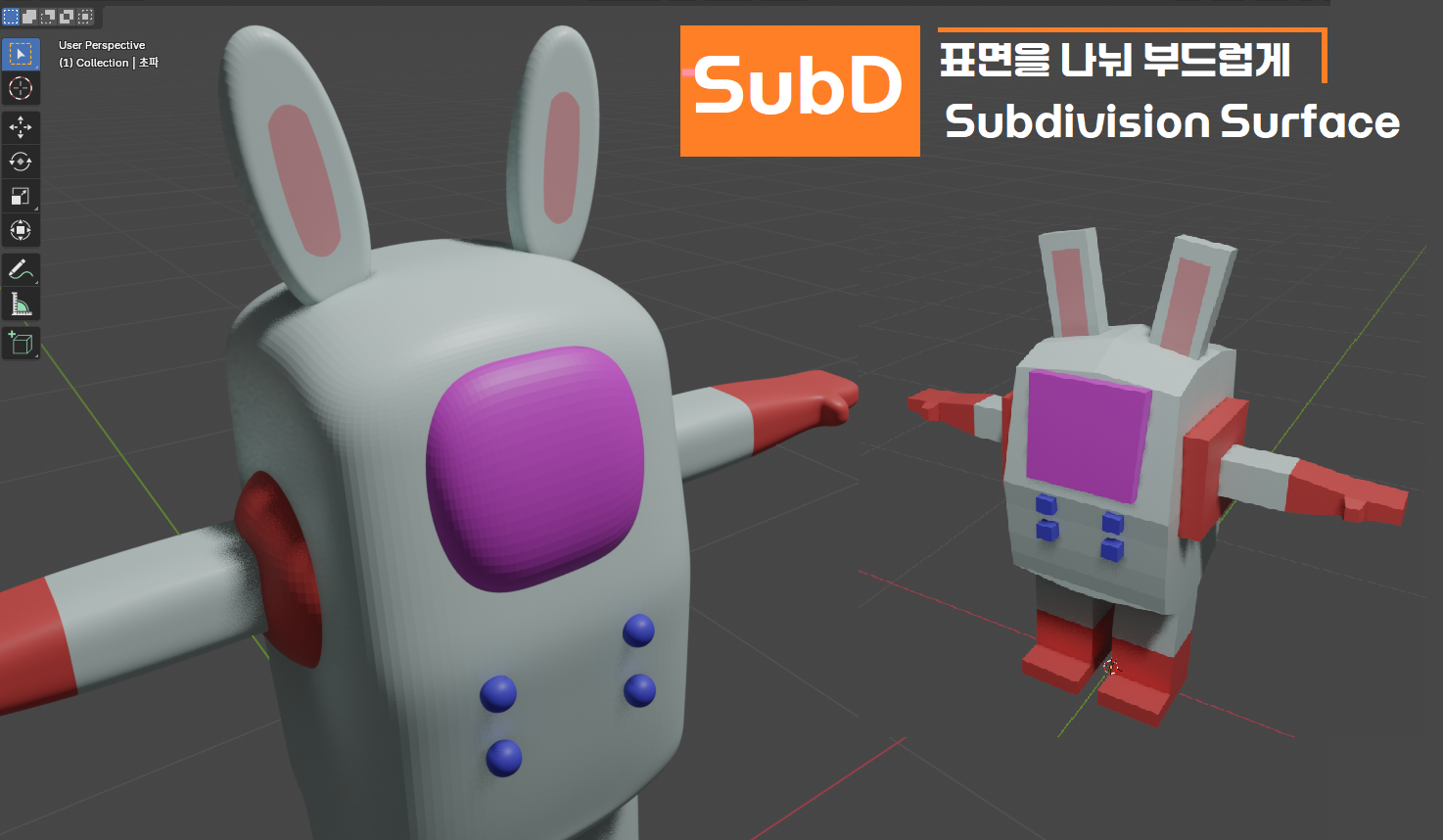 섭디는 블렌더에서만 사용하는 개념이 아닌 3D그래픽의 전분야에서는 부르는 명칭입니다. 영화나 품질좋은 애니메이션의 장면을 3D로 묘사하려면 섬세한 수백개의 표현이 하이폴리(High-poly)필요하고, 게임과 통신의 반응속도 측면에서 장점이 있는 경우에는 적은 표면을 갖고 있는 로폴리(low-poly)를 지향한다. 그럼 네모난 캐릭터만 나와야 한다는 것은 아니다. 편집모드에서 표면의 필요한 만큼 나누고 오브젝트모드의 선택한 개체(오브젝트, 물건)을 부드럽게 처리하는 섭디 모디파이어를 이용하면 귀여운 캐릭터를 만들 수 있습니다.