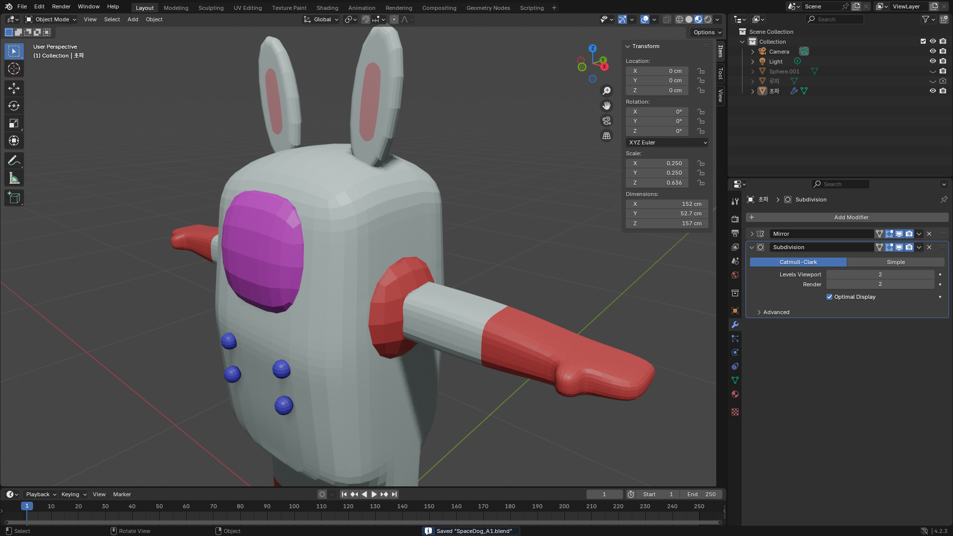아래는 Subdivision Surface를 처리하고 마무리로 오브젝트 모드에서 Shade Auto Smooth를 처리하면 조금더 개체 표면이 부드럽게 처리되어 보여진다.