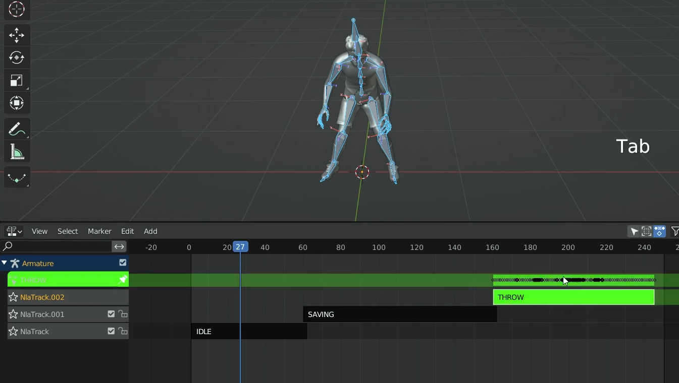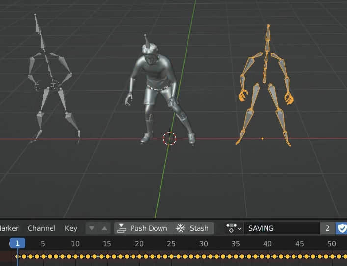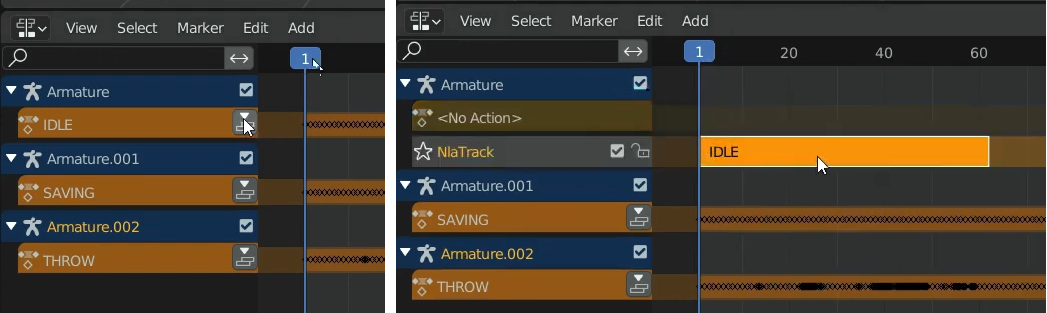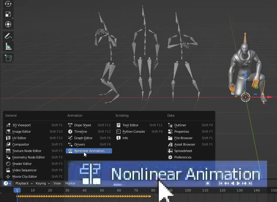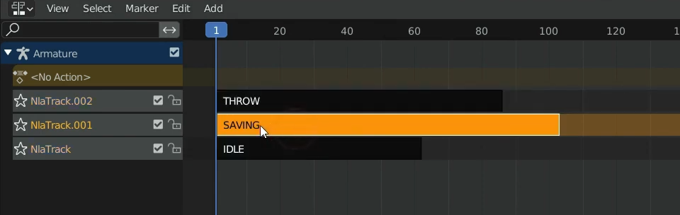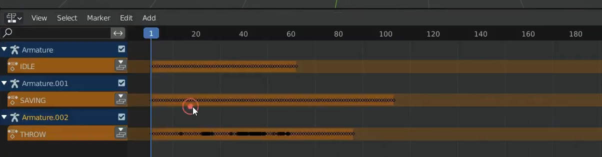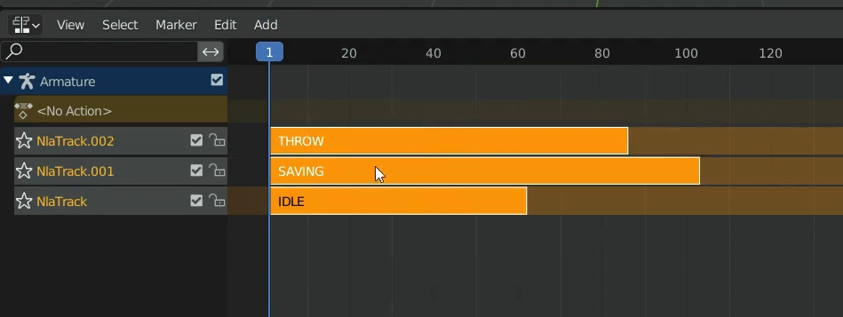Nonlinear Animation을 선택하면 각 Action별로 아래 그림과 같이 정해놓은 이름이 오렌지색으로 각 뼈대별로 보이는 것을 확인 할 수 있습니다.
