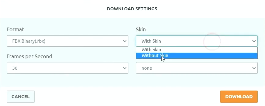 믹사모에서 1개는 모델(Skin)과 함께있는 기본 FBX파일 다운로드를 준비하고, 이어지는 다른 동작은 Without Skin을 선택하여 1개이상을 다운로드 합니다. 첫번째로 가져오는 FBX는 여러분의 모델과 동작이 들어간 기본 내용이고, 그외의 FBX는 이어지는 동작들로 1개의 모델에 Mix하기 위함입니다.