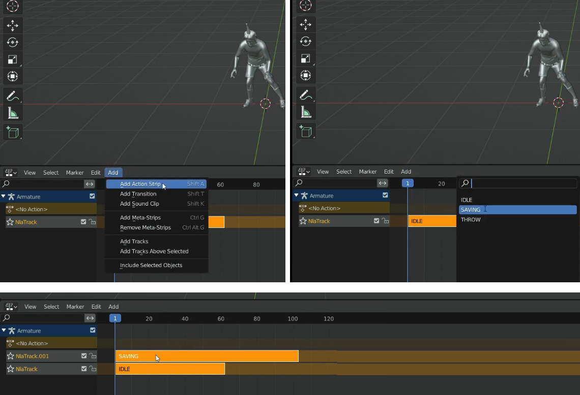 모델이 연결된 아마튜어의 새로운 액션을 추가하기 위해 클립을 선택한 상태에서 Add 메뉴를 누르고 Add Action Strip을 누르고, 검색창이 뜨면 첫번째 동작을 선택해 줍니다. 그러면 추가된 액션이 위에 레이어 구조처럼 추가되어 쌓여 있는 것을 볼 수 있습니다.