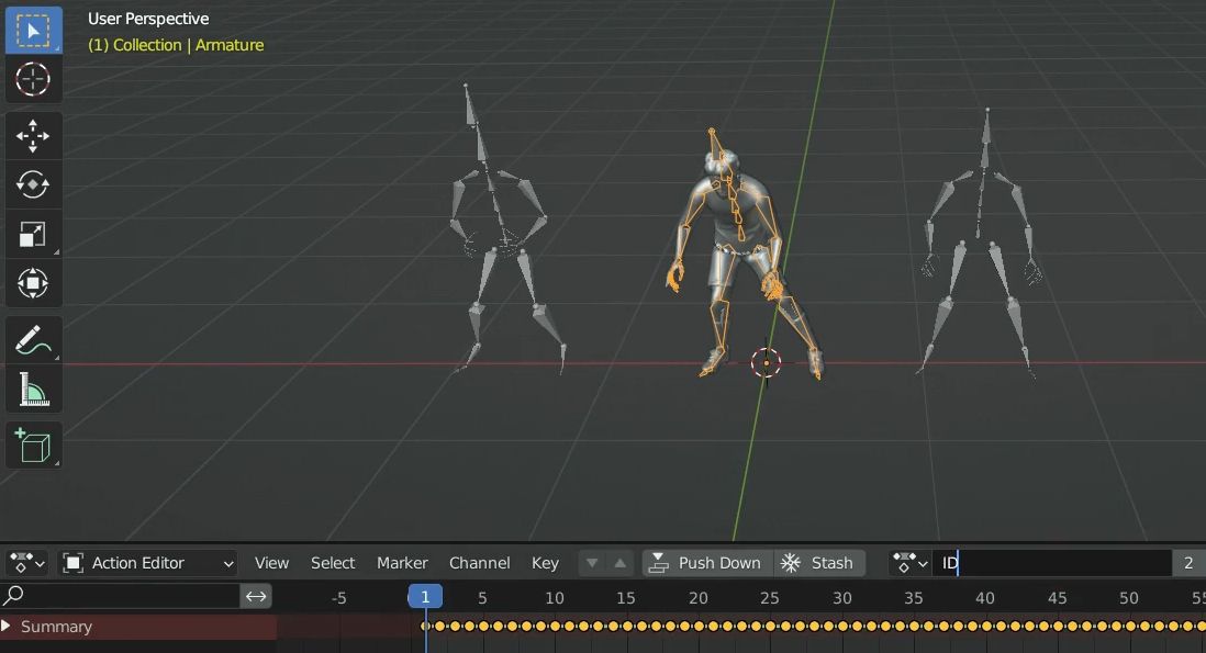 Dope Sheet 의 Action Editor로 타임라인 환경이 아래 그림처럼 최종적으로 바꿔줍니다. (참고로 도프는 마약, 진한 액체란 사전적인 의미를 갖고 있습니다. 진하게 액션 편집을 해봅시다.) Action Editor바에서는 기본이 Summary로 전체 항목이 썸머리되어 보여집니다.