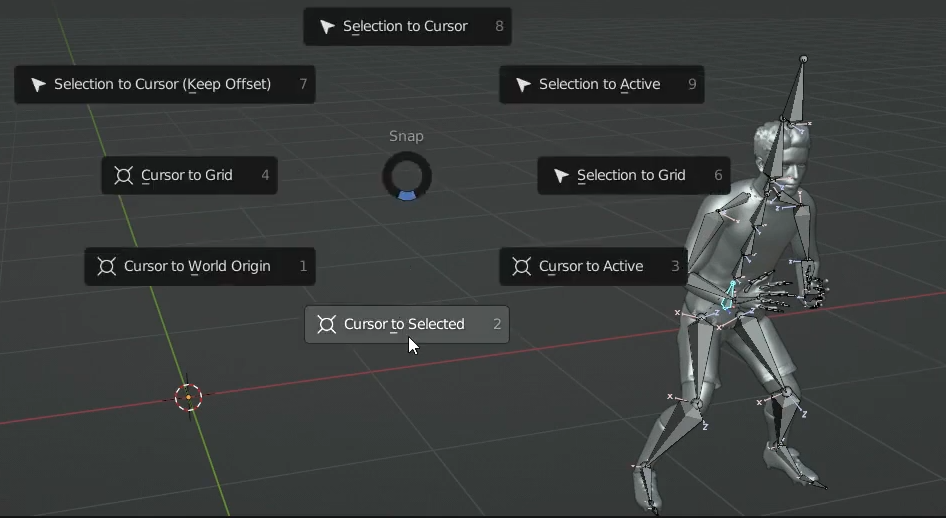아래 그림과 같이 아마튜어의 힙본을 선택하고 Shift+S키를 누르고 Cursor to Selected를 선택하고 'i'키를 눌러서 Insert Keyframe Menu를 띄웁니다.