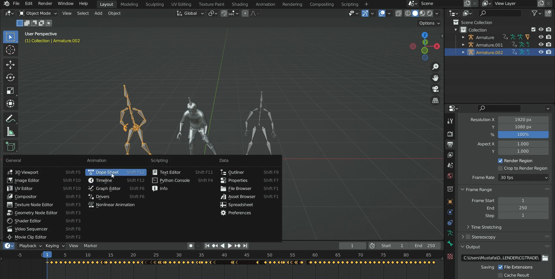 Amature(뼈대)를 선택하고 타임라인을 펼쳐서 보면 키프레임들이 노란색 ◆으로 다수가 보여집니다. 키프레임들을 동작에 따라서 일부를 지우고 편집할 수 있습니다.