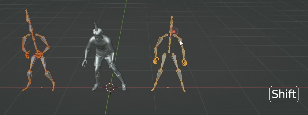 블랜더를 실행하고 기존의 Scene에 존재하는 기존 큐브, 카메라, 조명 등을 'A'키를 눌러서 모두선택하고 지워주고, File-Import를 이용해 다운로드한 FBX파일을 찾아 가져 옵니다. 화면중앙에 Amature가 추가된 것을 확인할 수 있습니다. 같은 방식으로 모델없는 Without Skin 2개도 가져옵니다.