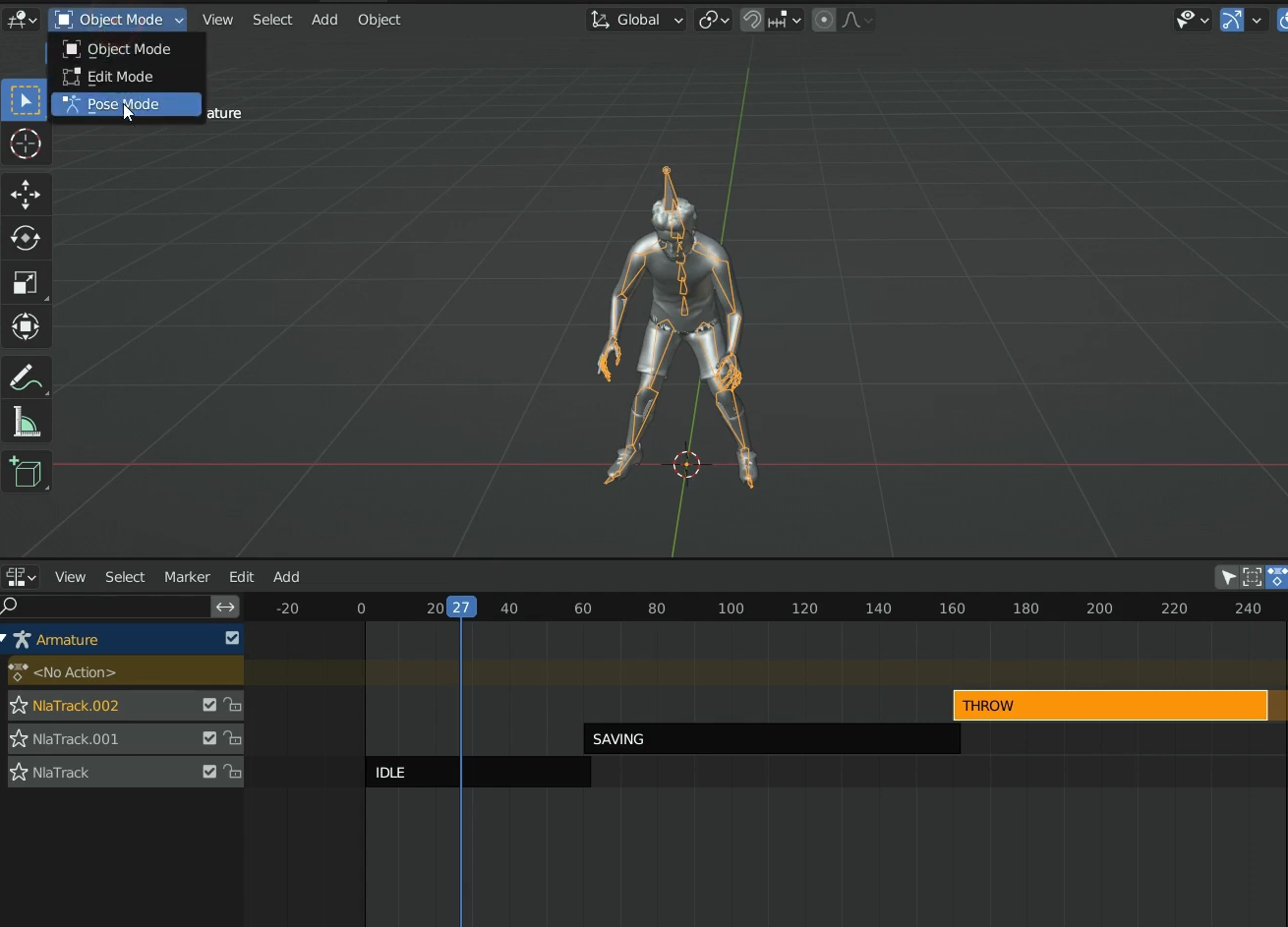 동작이 자연스럽게 연결되지 않는 부분은 아마츄어를 선택하고 좌측의 Object Mode버튼을 누른 후 Pose Mode로 들어 갑니다.