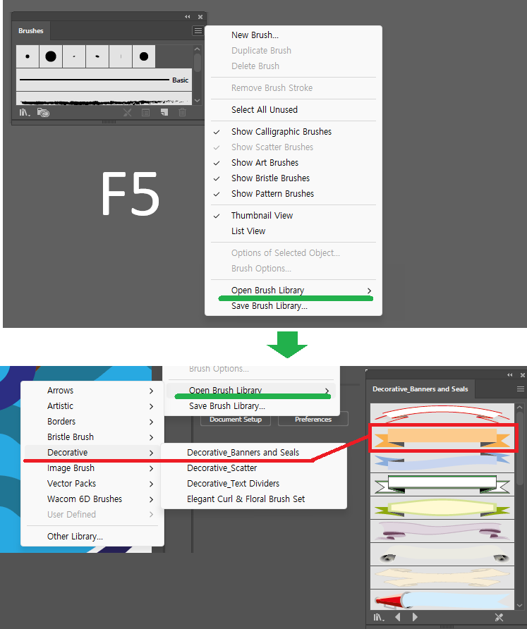 도형활용 / 지그재그 물결 / 리본 아트브러시 / 클리핑마스크 기본도형의 활용법으로 직사각형의 모서리를 둥글게 처리하는 기본형상들, 파도의 물결을 단순한 수평선을 선택후 Effect - Distort - ZigZag를 둥글게 하면 되고, 세로의 타원에 클리핑마스크를 적용하면 된다. 리본은 절대 그리지말고, F5키 누르면 뜨는 브러시창에서 三 버튼 누르면 Open Brush Lib.에서 찾으면 있는 아트브러시를 선에 적용하면된다.