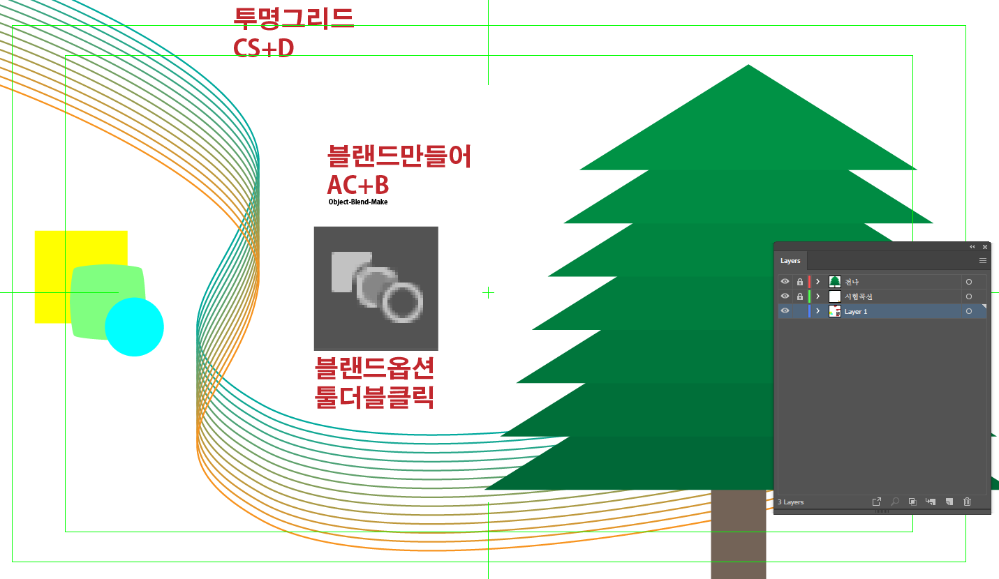 블렌드 명령과 옵션의 사용은 곡선을 펜툴로 그리고 복사 후, 원본곡선은 Ctrl+2잠근다. 그리고 그자리에 복사했던 오브젝트를 그자리 붙이기Ctrl+F 단축키로 붙이고 직접선택도구로 선의 변화를 준다. 끝인가?? 이어서 잠긴 모든 오브젝트를 Ctrl+Alt+2 풀어준다. 그리고 2개의 곡선을 선택하고 알트와콘트롤 줄여서 AC+B 메뉴 Object - Blend - Make로 선택이 기본 부드러운 그라데이션 처럼 보이고, 최종작업으로 Blend처리된 개체를 선택하고 블랜드툴을 더블클릭해 Blend Option창에서 Space공간표현을 3개중 2번째 Step 단ㄱ몌를 대략 14정도 주면 16개의 블렌드 곡선을 표현할 수 있다.