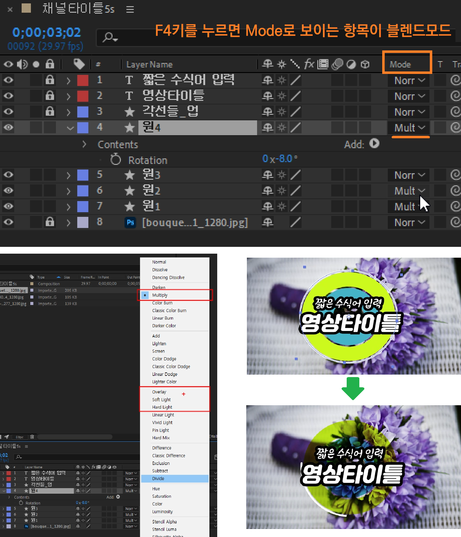 프리미어 프로에서 배운 블렌드모드는 아래 어떤 사진 및 이미지와 같은 형상이 있고 위에 있는 레이어(혹은 트랙)에 적용하는 것으로 애프터이펙트에서도 위에 두께가 굵은 선에 적용하면 투명한유리같이 보이지면 위에 선색상에 따라 아래에 색유리처럼 겹쳐 보이는 아름다운 색상이 섞인 효과를 얻을 수 있습니다. 보통은 Mode라는 항목이 보이지만, 안보이는 경우 F4키를 누르면 보여지고, 기본 Nomal을 눌러보면 다양한 색상과 밝기에 따른 블렌드모드 항목이 나열됩니다. 추천하는 것은 Multiply와 Overlay 모드로 진한 유리색상과 밝게 과다노출된 색상효과를 투명도같은 느낌으로 나타납니다.