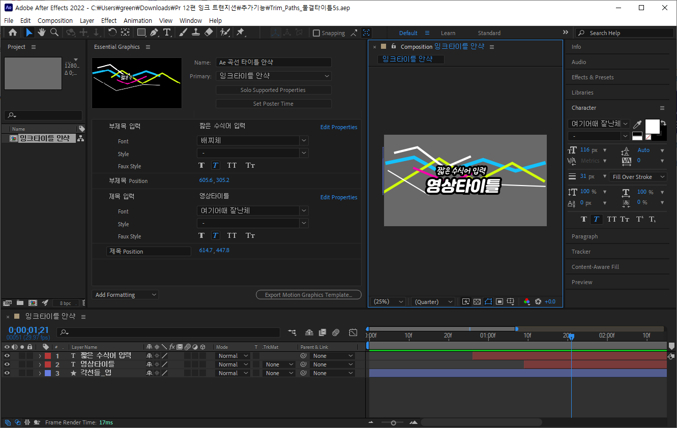 애프터이펙트에서 타이틀을 애니메이션하는 된 템플릿 제작원칙은 우선 가로/세로/정사각의 1:1비율의 영상 프레임크기를 고려해서 콤프를 생성합니다. 여러분이 아는 무료 디자인서체(Chractor) 포함(없으면 굴림체)해서 문단(Paragraph) 좌/우/중앙을 고려해서 타이틀의 스타일 예시를 입력하고 애니메이션 준비를 합니다. 너무 많은 글은 불필요 합니다.