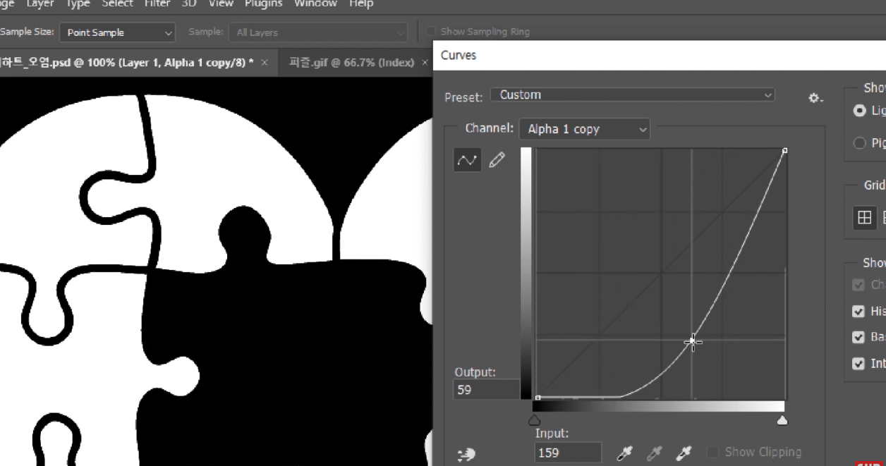 02. 퍼즐의 일부를 지우거나 별도 채널에 저장한 상태에서 빈 부분에는 1px 정도의 티끌이 보여지는 데, 이 티끌 부분은 단축키 Ctrl + M 커브라는 이미지 색상/채도/명도를 보정명령으로 중간에 점추가 후 내려서 곡선을 그림같이 조절을 통해 윤곽을 진하게 명암으로 보정할 수 있습니다.