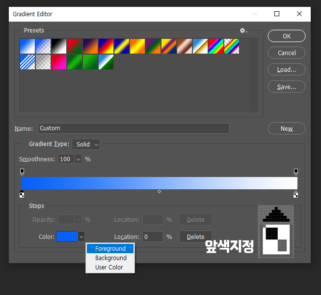 Gradient Editor에서 편집한 색상은 Name항목에 이름을 주고 [New] 버튼을 누르면 저장이 되어 그라디언트 색상견본에 포함이 됩니다. 이름주고 [OK] 버튼누르지 말고 [New]를 꼭 누르세요. 버전에 따라서 그라디언트 색상견본은 다른데 아래는 하위버전의 몇개 안되는 색견본이지만 최신버전에는 목록이 잘 보여집니다.