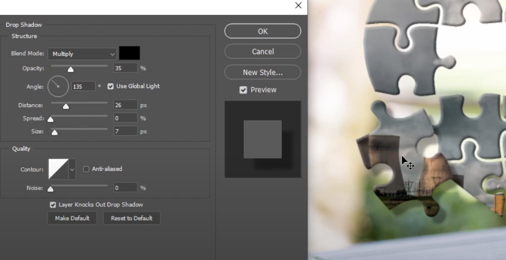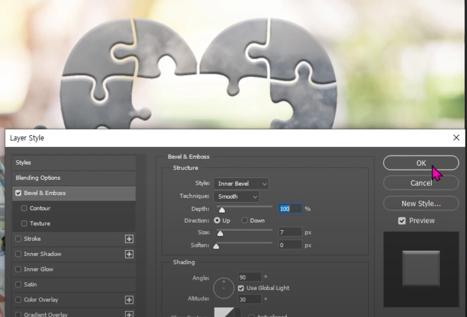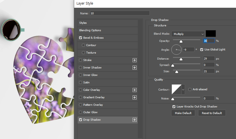 03. fx 퍼즐 조각 전체를 Bevel&Emboss로 입체감을 주고, 복사한 스타일을 붙인(Copy & Paste Layer Style) 일부 조각은 추가로 Drop Shadow로 떠있는 그림자효과를 적용해서 완성할 수 있습니다.