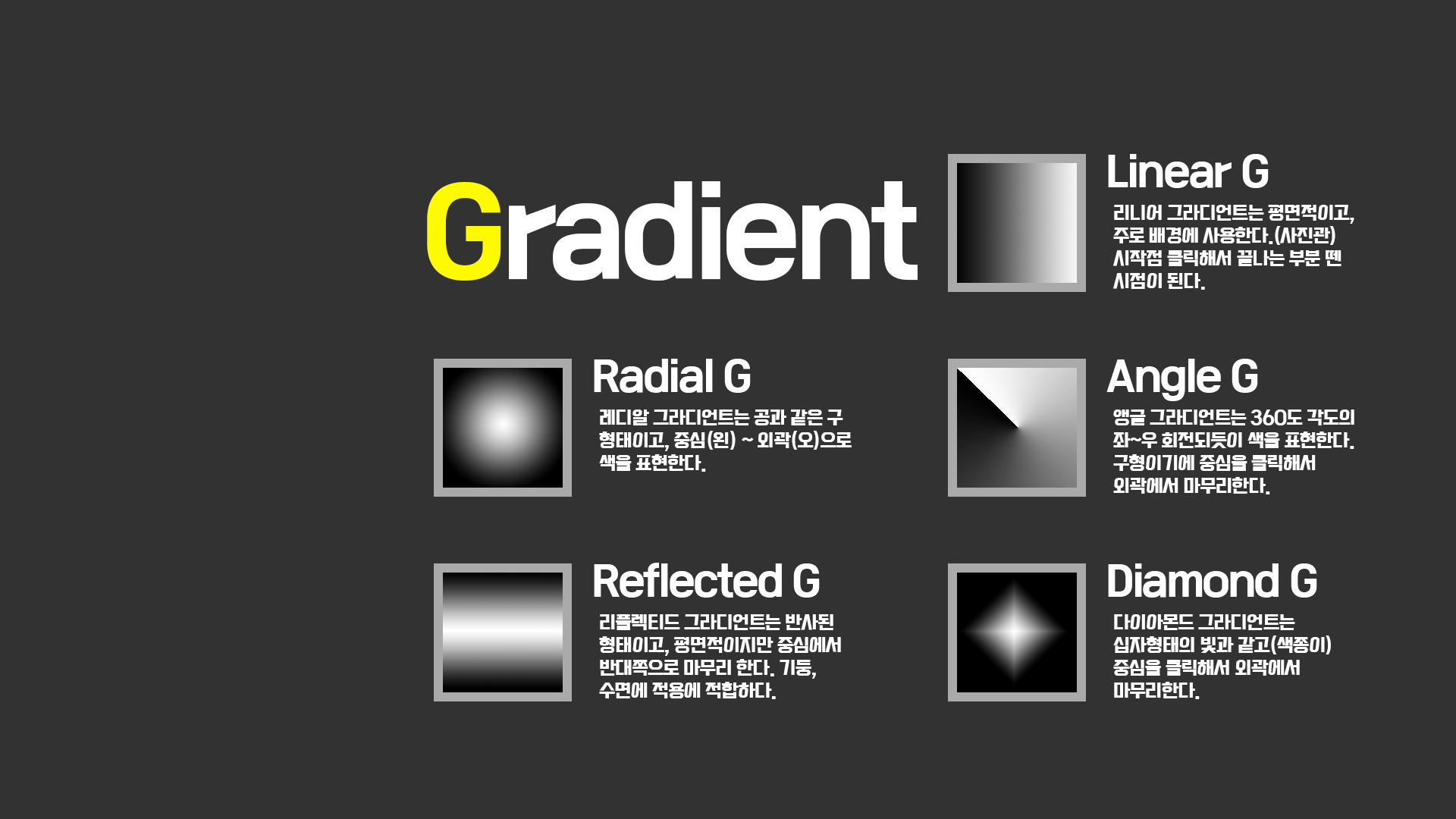 Gradation 파워포인트에서도 흔히보는 채워지는 색상은 단색으로 표현하는 것 외에 두가지 색상과 불투명도로 그라데이션을 표현할 수 있습니다. 기본 툴바에 페인트 버킷과 함께 있는 그라디언트 도구는 옵션바를 통해서 5종의 표현을 할 수 있는데 아래 그림을 참고하여 왼쪽 어느 부분을 클릭하여 시작하고~ 오른쪽 어느 부분까지 드레그 한 후에 마우스를 떼면 왼쪽에서 오른쪽으로 그라데이션이 표현 될 것입니다.
