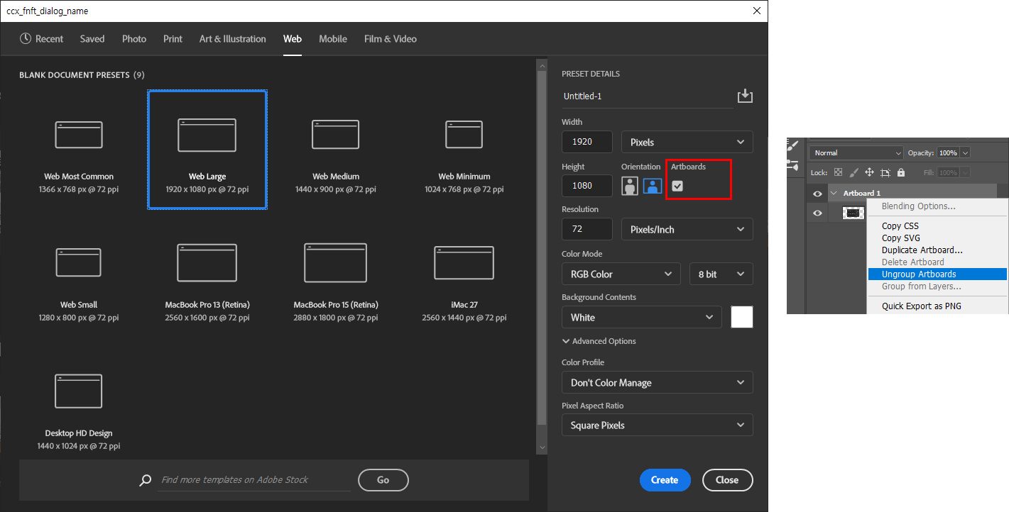 제작하려는 디자인의 규격을 알고 제작시에 Ctrl N 새 문서에서 원하는 규격을 찾아서 새문서를 만들어 보자! 바탕화면 크기의 문서를 위해 Web - Web Large를 선택하면 기본인 흰색의 배경으로 새 문서가 만들어 진다.