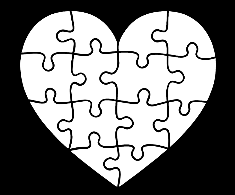 [알파채널의 디자인활용 예제2] 아래 검을 배경의 흰색 퍼즐모양의 그림(1057x 853px)이 있습니다. 그림을 다운로드 후 포토샵에서 열어보고 디자인 작업중인 웹 라지 크기의 1920x1080px 새 문서에 어린이 사진을 배치하고 하트퍼즐을 알파채널을 만든 후에 붙이면 동일한 형태의 흰색 부분만 남는 멋진 작품이 될 수 있습니다. 일부