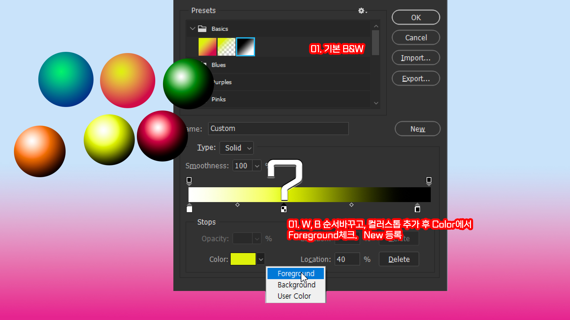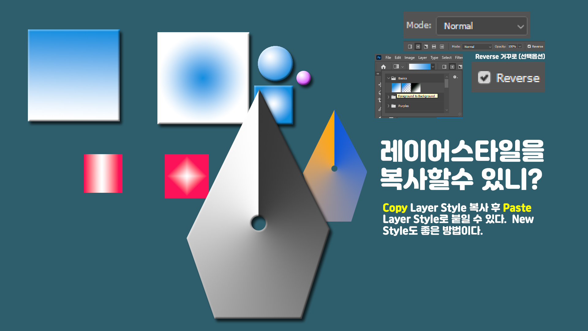 ※ 포토샵에서 공간을 채우는 채색방법은 3가지 : 빨강색, 노란색 등 하나의 색인 단색(Solid), 2종이상의 색으로 만드는 그라디언트(Gradient), 타일형태로 반복되는 패턴(Pattern)이 있으니 알아두세요.