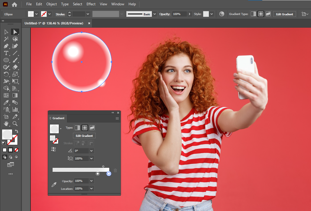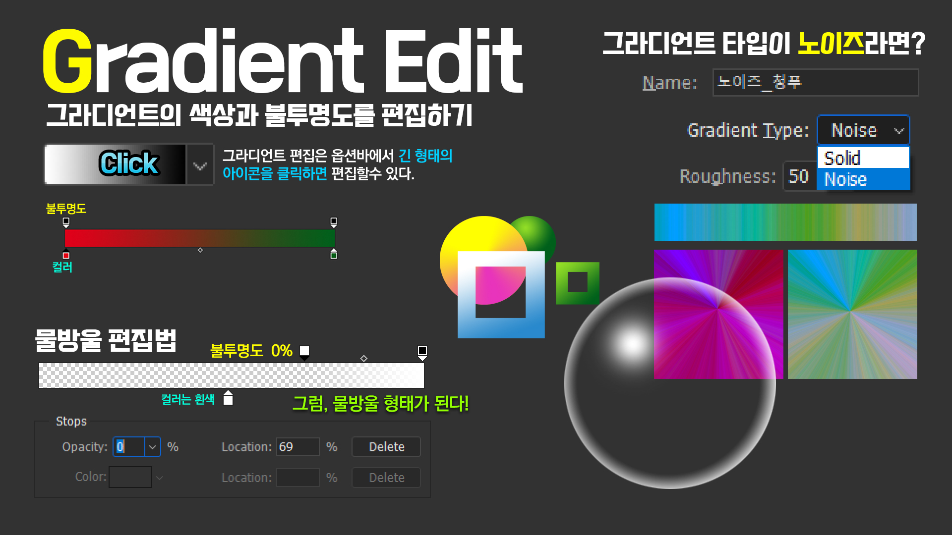 일러스트레이터의 Linear / Radial 2가지 등록가능한 그라디언트 중에서 투명도를 표현한 비눗방울 소스의 표현예시