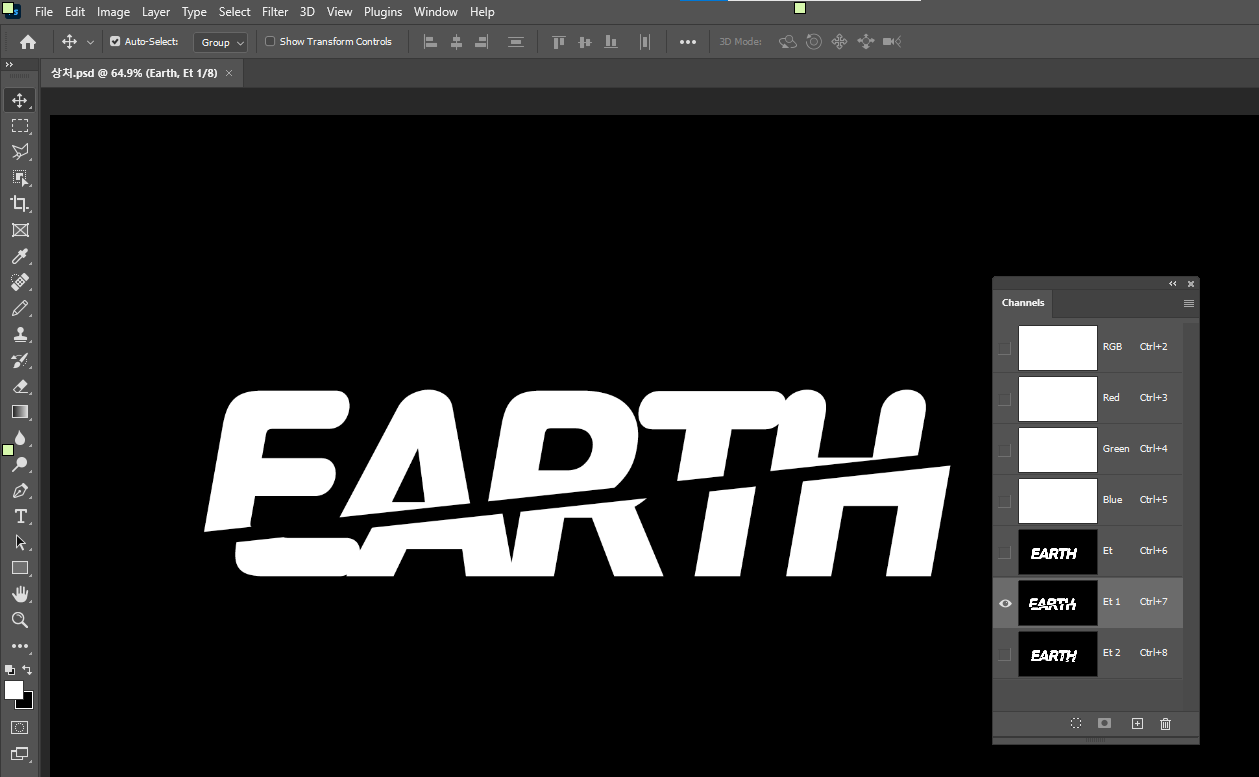 [알파채널의 디자인활용 예제1] 텍스트로 이산화탄소 화학식 CO2를 입력하고, 자유변형(Free Transform.Ctrl+T)으로 불균형을 표현하기 위해 회전을 주었습니다. ① 회전을 준 레이어의 썸네일을 Ctrl키를 누르면서 클릭하여 형상만큼 선택화되는 Load Selection 후, 레이어 옆 채널에서 알파채널상에 고유의 이름으로 Save Selection하였습니다. ② 알파채널에서 CO2형상에 아랫부분을 검은 색상으로 Delete(Del)키를 눌러서 채워서 잘려진 것 처럼 형상을 바꿨습니다. ③ 잘려진 CO2형상의 알파채널 썸네일을 Ctrl키를 누르면서 클릭하여 Load Selection 후 레이어로 가서 새 레이어를 만들고 준비된 나뭇잎을 선택된 상태만큼 Via Copy(Ctrl+J)를 하여 CO2 형상의 글씨를 만들었습니다. ④사실적인 그림자 표현을 위해 알파채널의 잘려져진 CO2형상을 복제하여 자유변형으로 아래로 뒤집어서 형상으로 변형시키고 위와 같이 채널에 선택영역만큼 검을색을 새 레이어에서 채웠고 약간의 불투명도를 레이어의 오파서티(Opacity 불투명도)를 약80% 정도로 조절해서 표현했습니다.