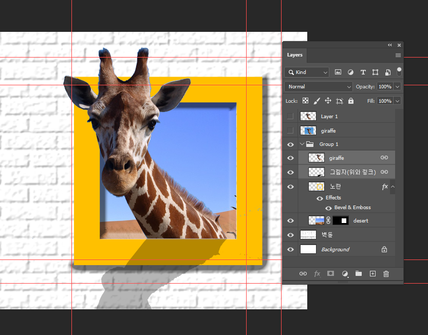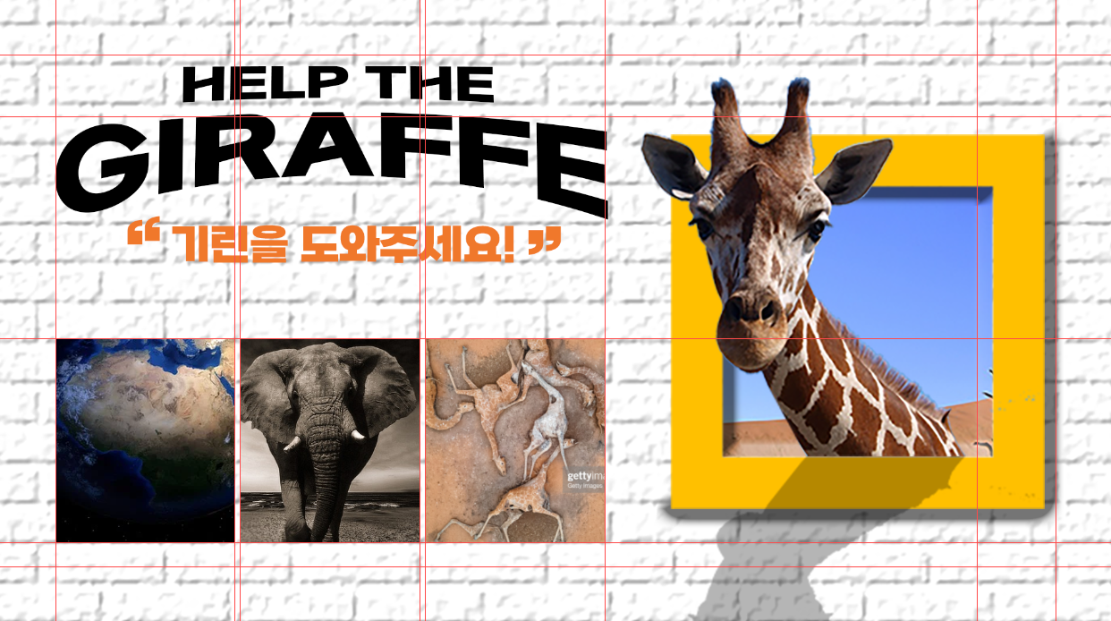 디자인의 레이아웃에 필요한 자(Ruler)와 안내선(Guide)를 기반으로한 영역을 나누어 특정한 주제에 맞게 작업하는 방법을 소개하며, 본 주제는 내셔널 지오그래픽 동물이 등장하는 노란색 사각형의 타이틀을 제작하는 예로 교육을 합니다.