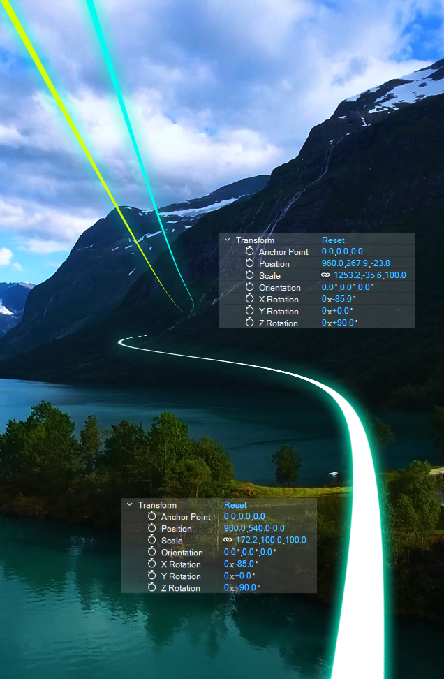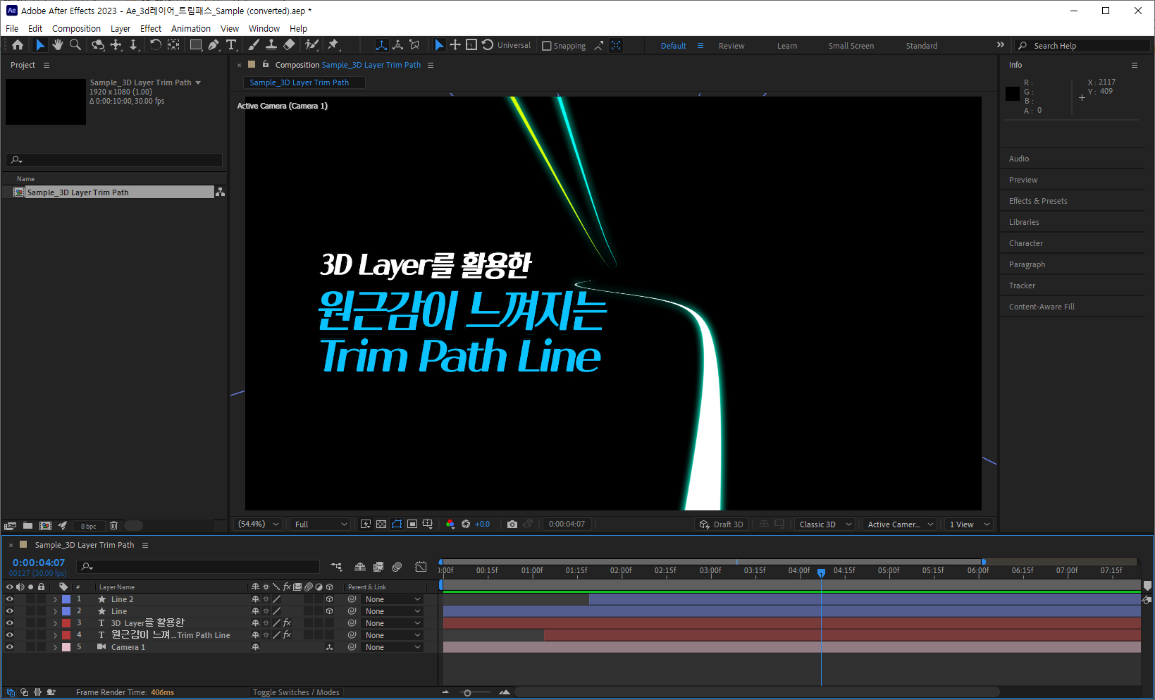 선형 모션그래픽에 제일 많이 사용하는 Trim Path는 지난 강좌에서 소개한 바 있습니다. 펜툴로 그린 라인에 트림패스를 적용하고 3D레이어로 변환시킨 후 Transform에서 X,Y,Z축 방향으로 다른 좌표값(아래 상세 좌표이미지 참고) 레이어 스타일 Outter Glow를 적용하면 영상과 같은 3차원의 원근감이 느껴지는 모션그래픽을 표현할 수 있습니다.