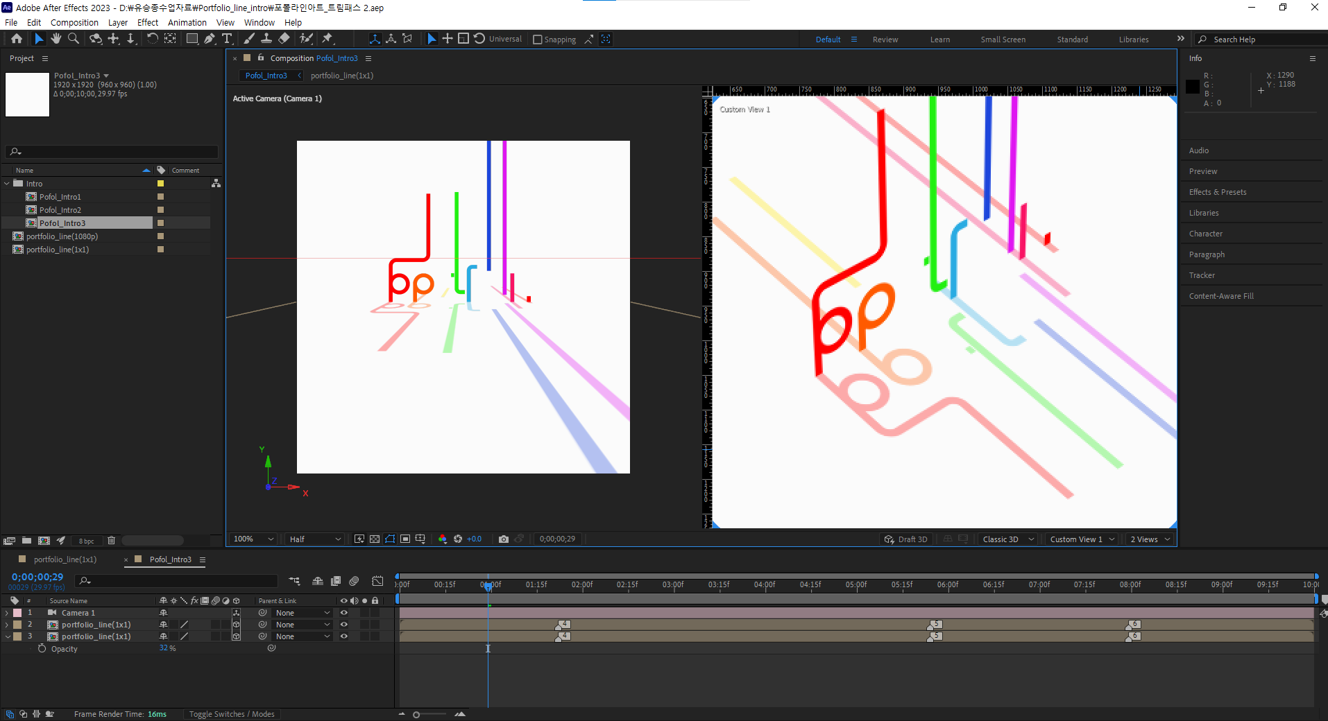 Portfolio의 커버디자인 혹은 인트로 화면이라면, 아래 Skill을 표현하는 모션그래픽 구현하는 강좌도 함께 보고 프로젝트 파일과 소스를구하는 게시물도 같이 봐야 도움이 될 것 입니다.