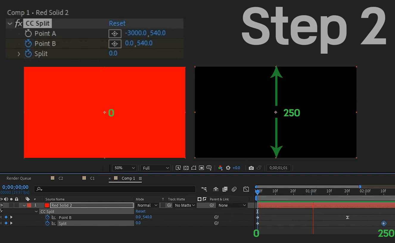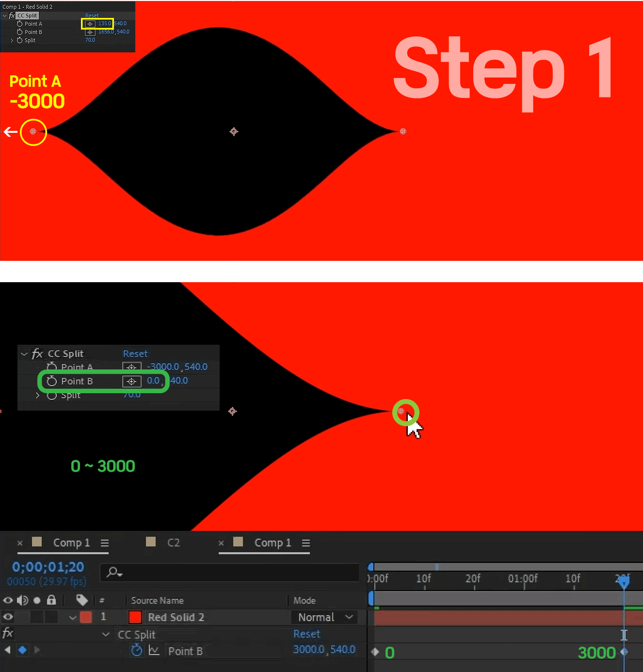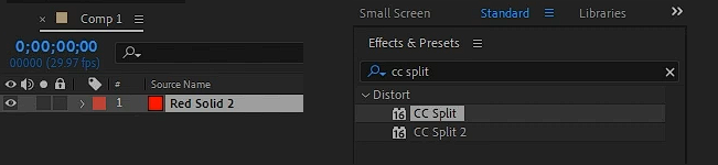 스플릿는 가르다, 분리하다 라는 뜻으로 주로 중심에 눈모양의 곡선 틈이 양쪽에 걸쳐서 나타나며 값을 올리면 아래 다른 대상이 보여지는 목적으로 주로 사용하는 효과이다. 그래서 트랜지션과 같은 효과로 가끔 소개되고 있다.