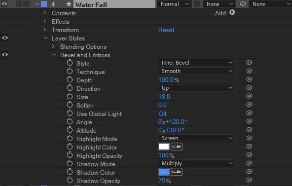 물줄기 같은 입자에 가깝게 Bevel and Emboss를 적용하고 색상을 흰색/짙은 파란색으로 스타일을 반영했습니다.