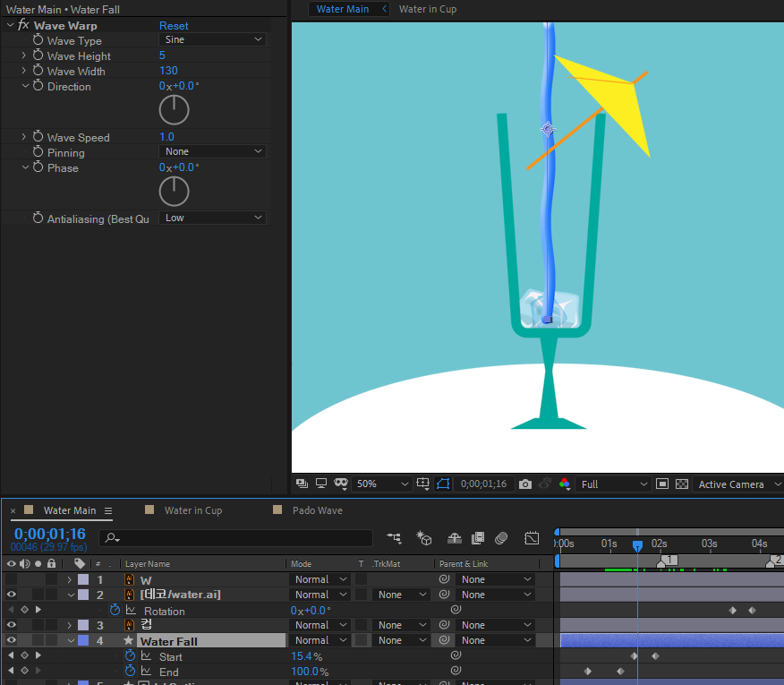 Wave Warp를 이용하는 경우 Track Matte Alpha를 적용해서 컵의 형태내에서 제한되게 보이게 하고 동일한 2개의 Tack Matte Alpha를 복제해서 다른 색상(밝은 색)으로 처리하면 아래와 같이 표현 할 수 있다.