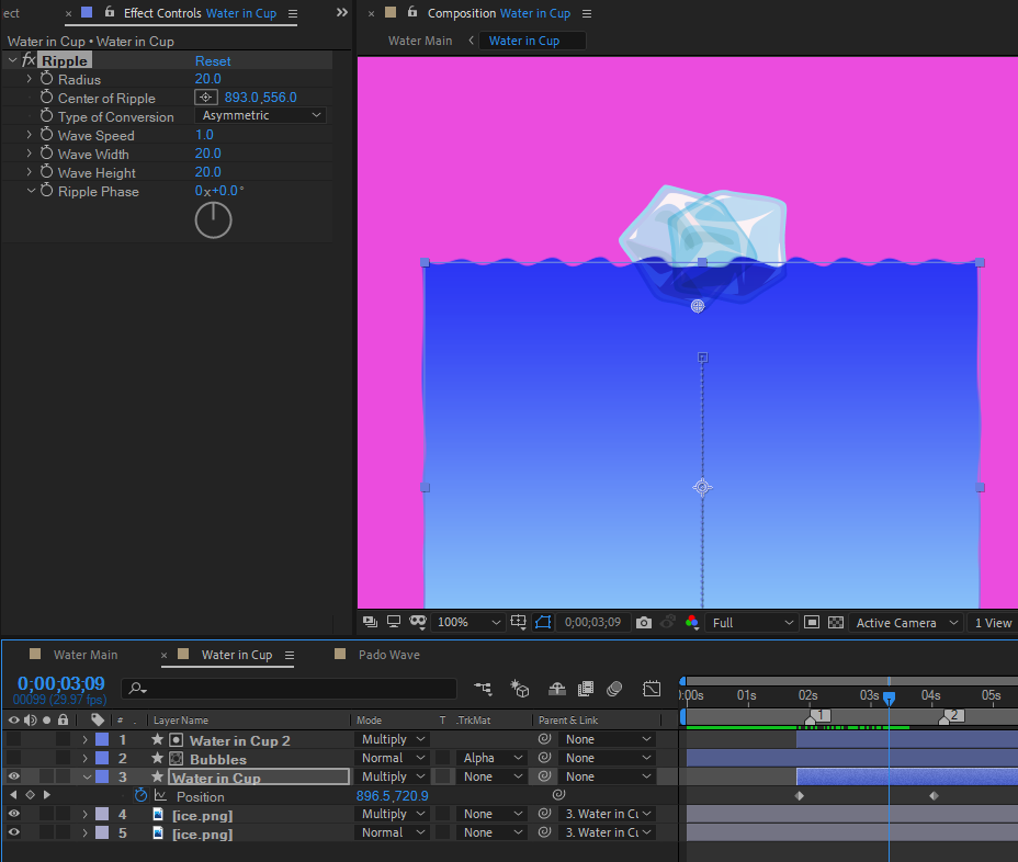 움직이는 Watter in Cup에 맞게 2개의 Ice를 Child로 처리해서 같이 움직이게 하였습니다. 버블도 적용한 후 Watter in Cup을 위에 배치하여 일부만 보이게 처리했습니다.