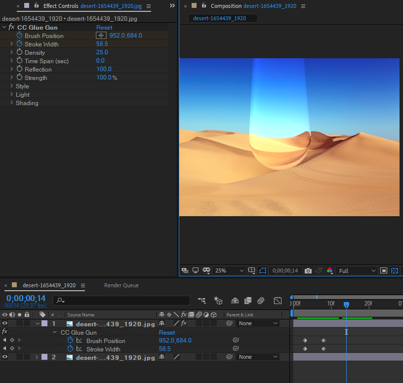 03. CC Glue Gun의 Brush Position과 Stroke Width에 변화를 주면 액체가 흘러내리는 표현을 할 수 있습니다.