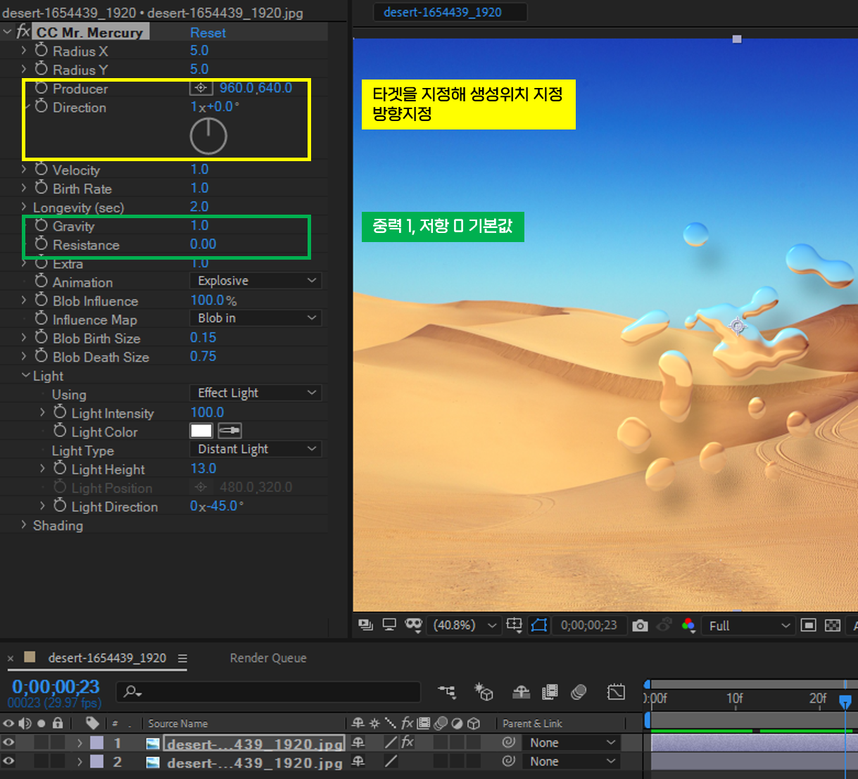 머큐리는 태양계에 있는 수성을 말합니다. 기본 이미지로 Comp를 만든 후에 C+D로 복제한 레이어의 동일한 사진이미지(혹은 비디오, 다른 콤프)에 적용하면 액체가 마치 물처럼 품어져 올라오 듯 표현 하는 기능으로 자동으로 키프레임 생성없이 간단히 표현 할 수 있습니다.