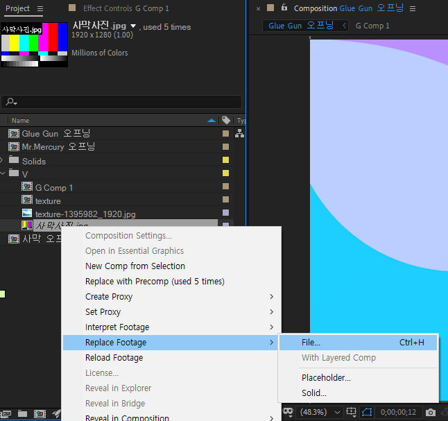 작은 팁 - Tip 작업한 Comp내에 파일명이나 경로가 바뀌는 경우는 아래 그림과 같이 오프라인 표시가 나는데, 이때 해당 Footage를 프로젝트 패널에서 선택 후 우클릭 Replace Footage - File (C+H)로 관련 이미지를 찾아주면 해결된다. 다른 이미지도 크기가 맞으면 대체된다.