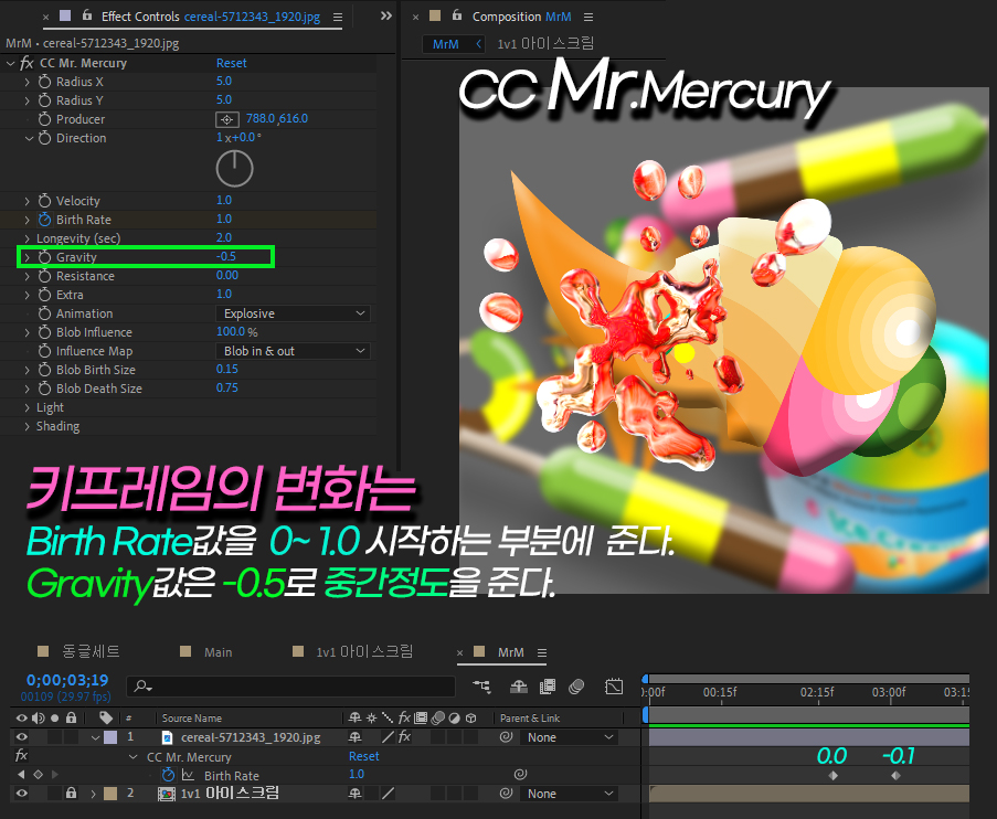 키프레임의 변화는 Birth Rate값을 0~ 1.0 시작하는 부분에 준다. Gravity값은 -0.5로 중간정도을 준다.