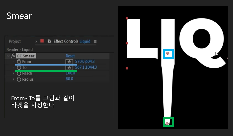 01. Text를 입력해주고 CC Smear를 검색후 적용하면, 아래 그림과 같이 From과 To 타겟의 위치가 기본으로 중앙에 잡혀있다. 시작하려는 위치와 끝나는 위치를 순차적으로 지정해준다.