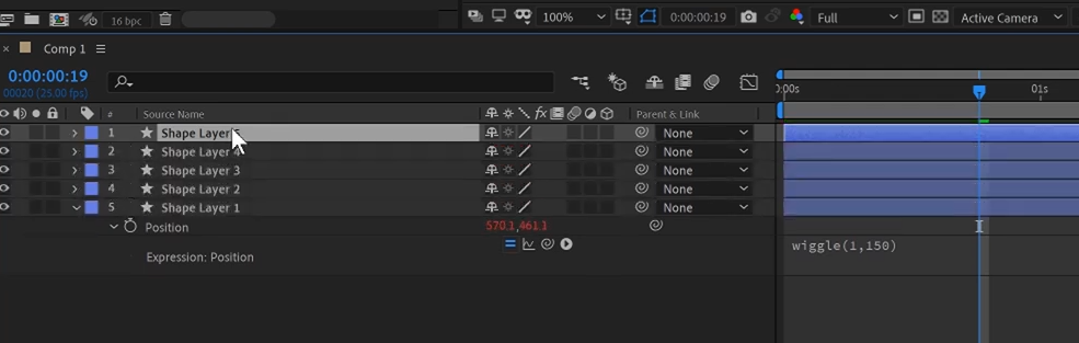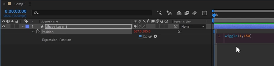 02. Shape레이어에 움직이는 속성을 위해 P 를 입력하고, Stop Watch를 Alt키를 누르면서 클릭하고 wiggle이라 입력하고 아래와 같은 표현식으로 완성을 해주면 1초에 150픽셀범위내에 떨고 있는 표현이 됩니다. wiggle은 흔들림을 주는 것으로 끈끈한 액체상태와는 무관하지만 적용하면 살아있는 흔들림을 볼 수 있습니다.