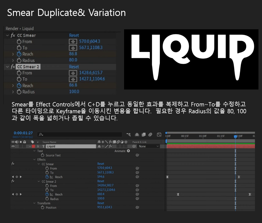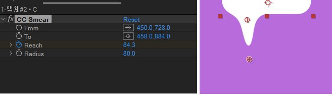 03. Smear를 Effect Controls에서 C+D를 누르고 동일한 효과를 복제하고 From~To를 수정하고 다른 타이밍으로 Keyframe을 이동시킨 변용을 합니다. 필요한 경우 Radius의 값을 80, 100 과 같이 폭을 넓히거나 좁힐 수 있습니다.
