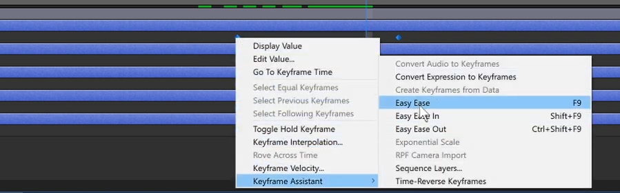 06. Adjustment레이어 아래 있는 레이어들을 선택하고, 오른 클릭해서 Keyframe Assistant에서 Easy Ease를 찾거나 F9키를 눌러서 Easy Ease를 모두 일정한 텐션감을 적용해 줍니다.